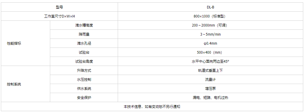產(chǎn)品簡(jiǎn)介:滴水試驗(yàn)裝置/滴水試驗(yàn)箱(Drip box) , 滴水試驗(yàn)裝置適用于外部照明和信號(hào)裝置及汽車(chē)燈具外殼防護(hù)。箱體結(jié)構(gòu):固定立柱,柱型升降導(dǎo)軌,滴水箱,水位調(diào)節(jié)供水箱,自動(dòng)升降機(jī),流量計(jì),濾紙,可調(diào)角度工作臺(tái),電器控制箱等組成。