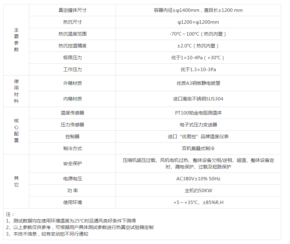 注: 1、測(cè)試數(shù)據(jù)均在使用環(huán)境溫度為25℃時(shí)且通風(fēng)良好條件下測(cè)得 2、以上參數(shù)僅供參考,可根據(jù)用戶具體測(cè)試參數(shù)進(jìn)行熱真空試驗(yàn)箱定制 3、本技術(shù)信息,如有變動(dòng)恕不另行通知 |