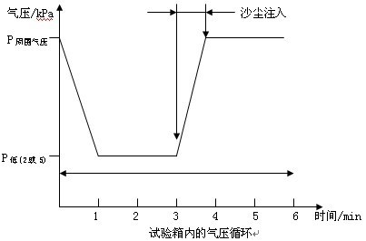 試驗用塵:試驗用塵是干燥的非磨蝕性的細粉塵,能夠通過篩孔為75µm,金屬絲直徑為50µm的平面網(wǎng)狀篩。本試驗中可以使用滑石粉,分析表明它可以滿足要求。試驗用塵使用次數(shù)不應(yīng)超過20次。應(yīng)注意維持干燥以保持粉塵細度,使用前應(yīng)在80℃下烘干2h. 塵濃度:試驗用塵的數(shù)量應(yīng)能夠使箱底基準表面上的沉降量均勻維持在(600±200)µ/(m²•h)。 氣流:試驗箱內(nèi)的氣流應(yīng)主要是自上而下的垂直氣流,而非層流。 氣流速度:氣流速度應(yīng)能夠使塵在試驗箱內(nèi)均勻分布。 濕度:試驗箱內(nèi)的相對濕度應(yīng)小于15%?梢酝ㄟ^提高試驗箱濕度實現(xiàn)。 樣品內(nèi)氣壓:根據(jù)樣品的運行條件,樣品外殼可以分為兩種類型: 類型1:樣品外殼內(nèi)的氣壓可能會與外界大氣壓不同,例如由運行中的熱力循環(huán)引起氣壓不同。 類型2:樣品外殼內(nèi)的氣壓跟外界氣壓相同。 相關(guān)規(guī)范應(yīng)闡明樣品外殼類型和壓力降。 砂塵試驗箱對于具有類型1外殼的樣品,應(yīng)放入試驗箱,并按照正常使用位置安裝。樣品應(yīng)承受圖中規(guī)定的壓降周期。根據(jù)相關(guān)規(guī)范中規(guī)定,壓力降應(yīng)為2kPa(20mbar)或5kPa(50mbar) 。 如圖所示,塵應(yīng)在每個循環(huán)周期內(nèi)注入。 對于具有類型2外殼的樣品,應(yīng)放入試驗箱,并按照正常使用位置安裝。此種情況下,不應(yīng)使用真空泵。