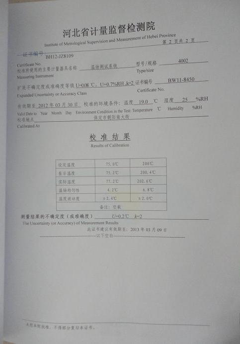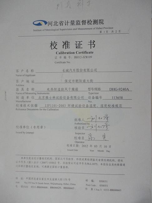 >>電熱恒溫鼓風(fēng)干燥箱校準(zhǔn)證書-河北計量院-長城汽車