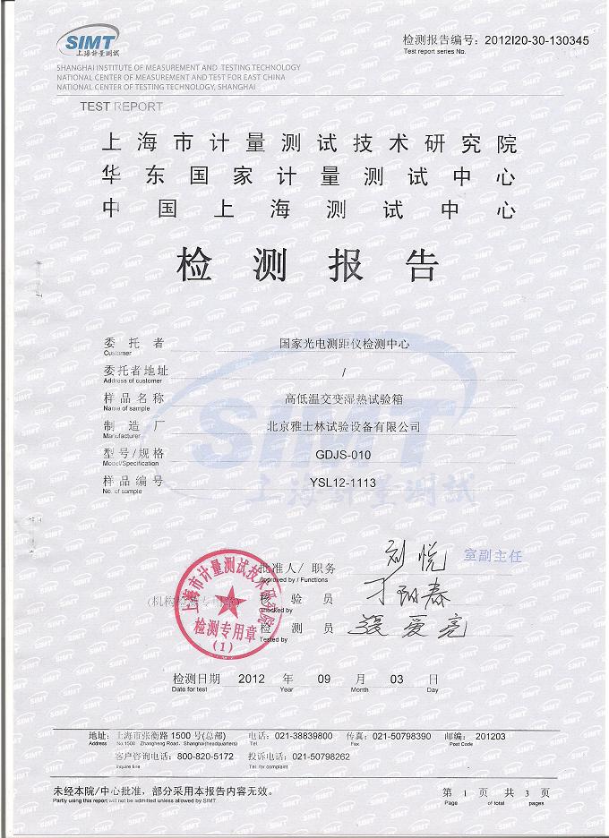 >>高低溫交變濕熱試驗(yàn)箱檢測(cè)報(bào)告-上海計(jì)量院-國家光電檢測(cè)