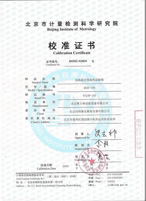 >>高低溫交變濕熱試驗(yàn)箱校準(zhǔn)證書-北京計(jì)量院-拉特激光