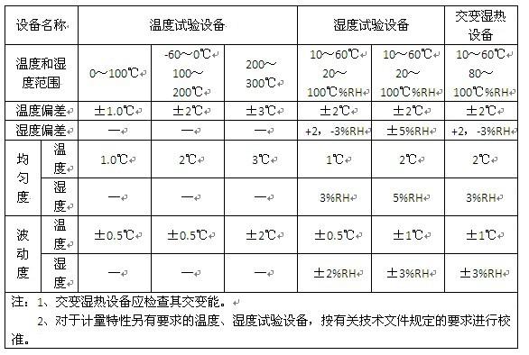 高低溫系列試驗箱出廠前廠家都會自帶一份內(nèi)部檢測報告,如內(nèi)部檢測報告不能滿足用戶要求時,可請計量院上門對設備進行檢測并出具檢測報告(需付費)。計量院會對高低溫系列試驗箱的溫度偏差、溫度均勻度、溫度波動度,相對濕度偏差、相對濕度均勻度、相對濕度波動度進行計量,其技術要求如下: